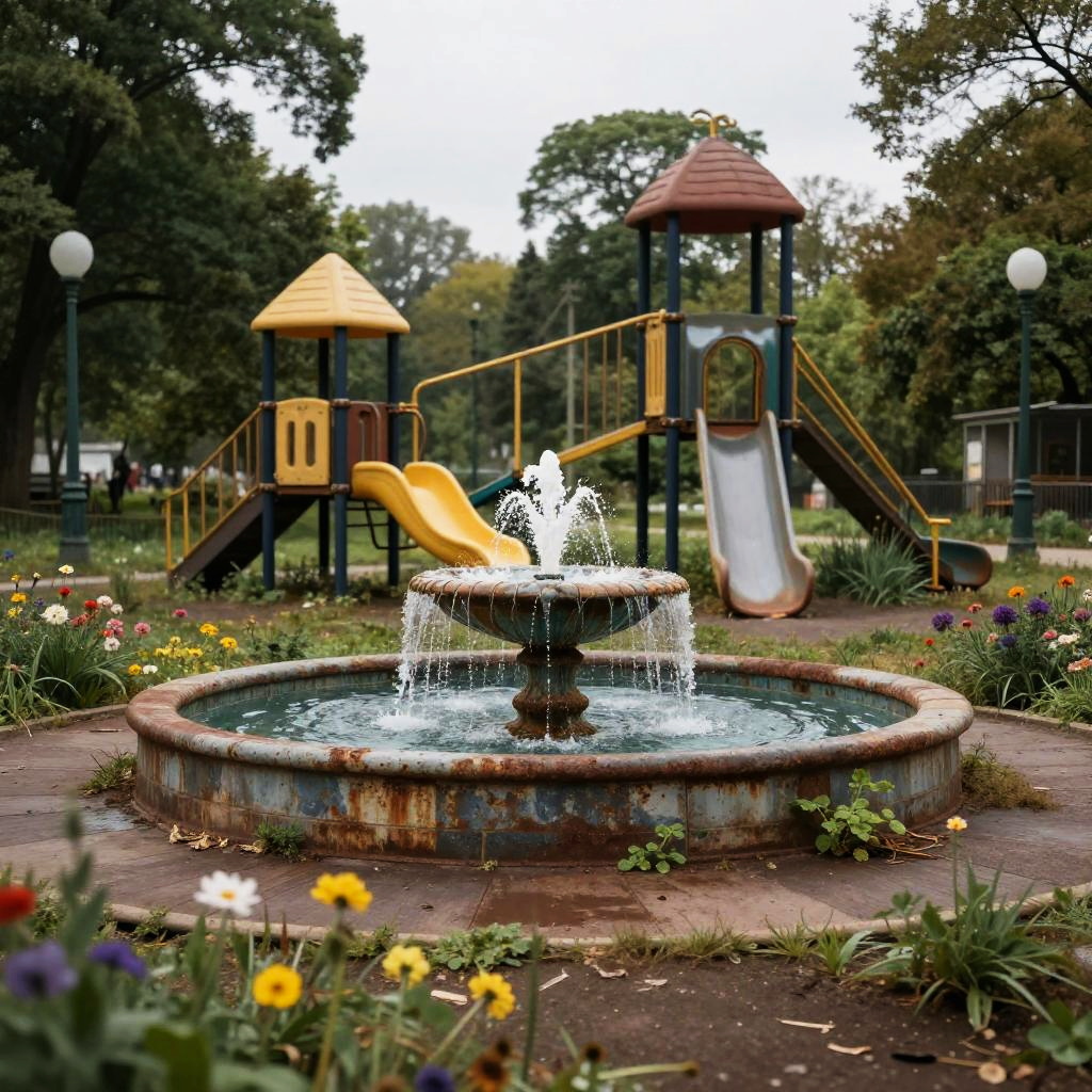 Photograph of a park with a central circular fountain, surrounded by colorful flowers, yellow and orange slides, and a wooden play structure, set against a