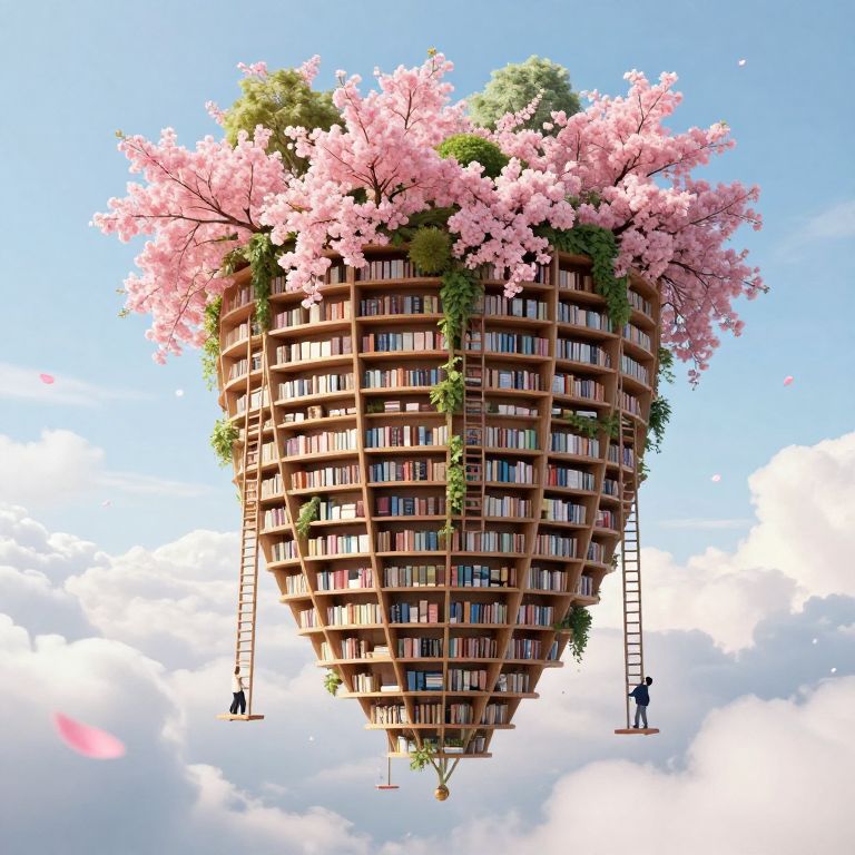 A towering, inverted library suspended in the sky, adorned with cascading pink blossoms and lush greenery, defies gravity as readers climb its spiraling shelves on ladders and ropes, surrounded by a serene expanse of clouds and floating petals.