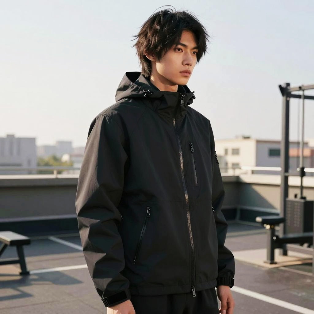 Wolf Cut hairstyle on fashion model, wearing high-performance jacket, in gym rooftop, captured in fashion editorial style with dynamic outdoor sunlight.