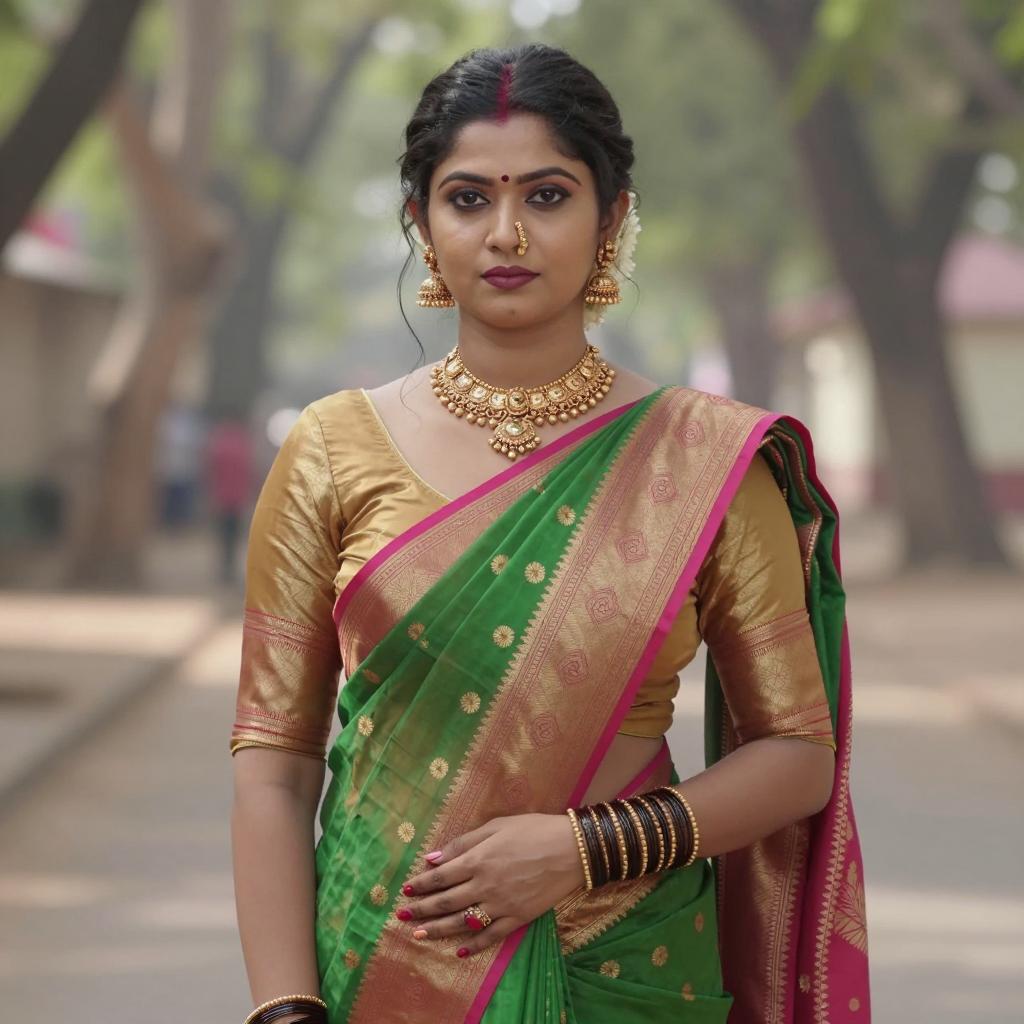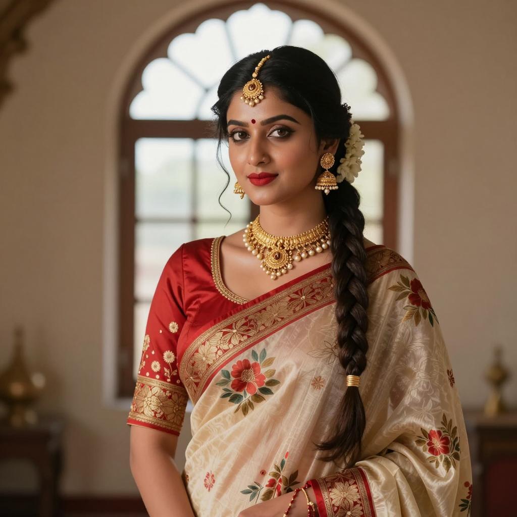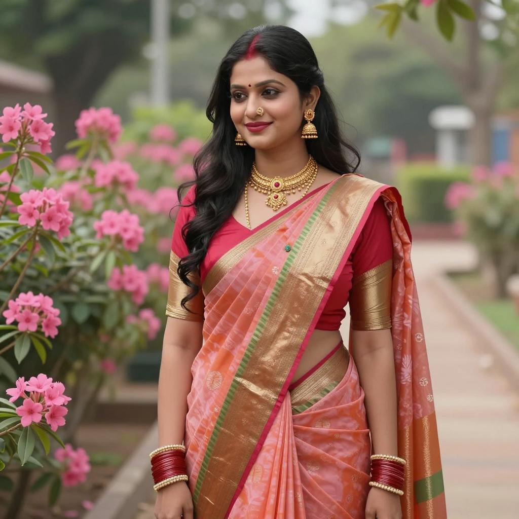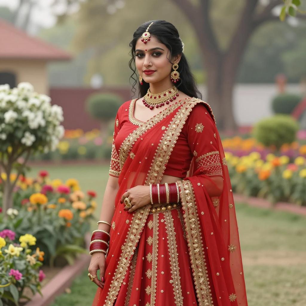 Jasmine aladdin red costume, photorealistic, young Indian woman, standing outdoors, daytime, wearing red traditional saree with gold floral patterns, red blouse, red veil on head, long dark brown hair, red bangles, gold necklace, red bindi on forehead, intense gaze, bright sunlight, soft-focus background, warm orange tones, green leafy plant on left, slight shadow on face, ethnic, elegant, cultural attire, traditional Indian dress, realistic ures, detailed clothing, natural light, portrait orientation