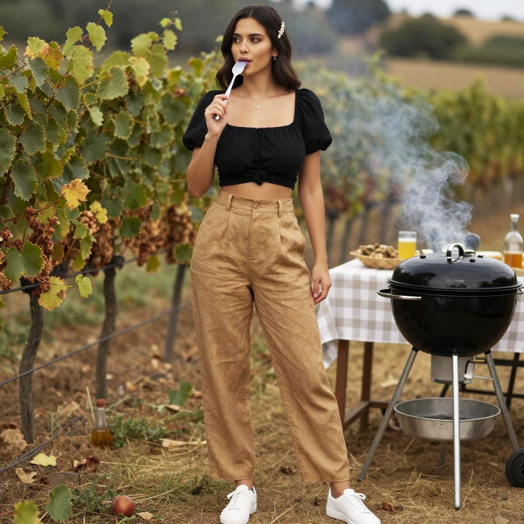 A slim woman in a casual-chic outfit featuring a cropped black puff sleeve top and high-waisted camel linen pants, paired with minimalistic white sneakers and a delicate hair clip, enjoys a BBQ gathering at the vineyard, captured in the visual style of Pedro Campos. Sexy. Pretty face and beаutiful eyes. Big breasts