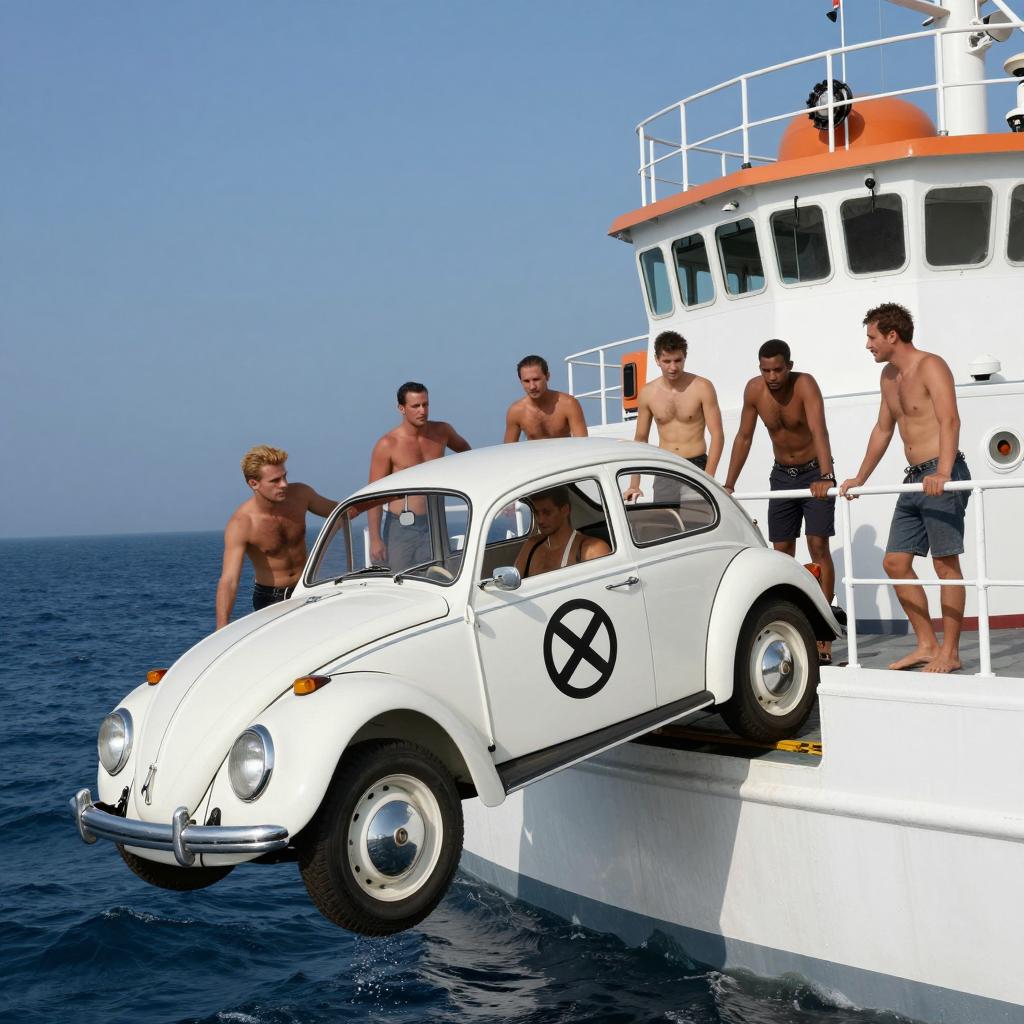 Photograph of a vintage white Volkswagen Beetle with a Nazi swastika on the side, hanging off the side of a white ship. Six shirtless men on the ship's deck, some with hands on the car, others watching. Orange dome-shaped structure on the ship's upper right. Clear blue sky and ocean in the background. Men have varied hairstyles, none with intense facial expressions. Dark waves beneath the ship. Ship's white railing visible.