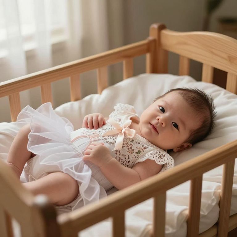 A newborn girl in a soft, traditional newborn ballet outfit with floral lace and delicate ribbons, lying gently on a wooden crib with a white tutu draped over her, the room is warm and cozy with soft daylight filtering through a window, the baby's face is softly lit, with large eyes and a sweet expression