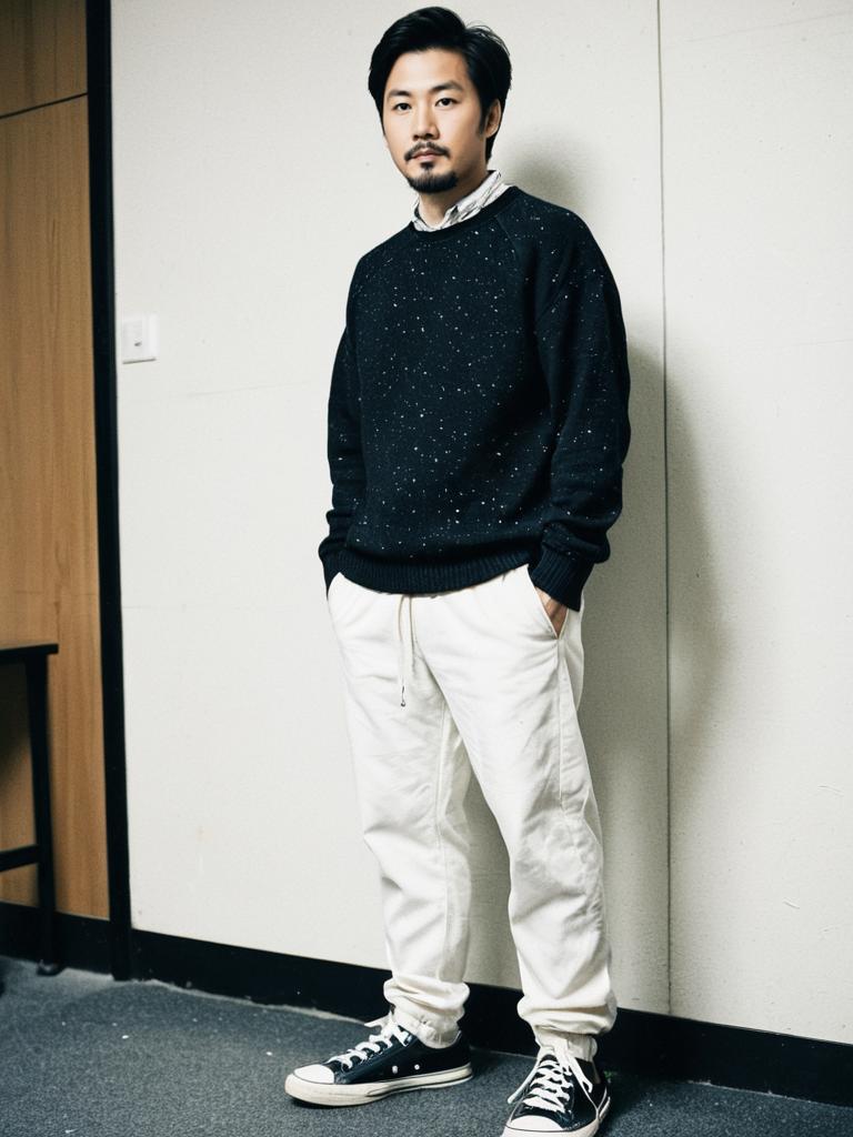 Sweat costume, 1boy, male focus, solo, facial hair, pants, full body, realistic, standing, white pants, short hair, shoes, looking at viewer, sweater, shirt, asian