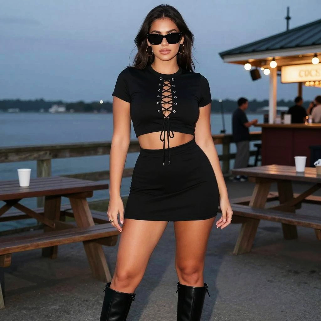A stylish woman wearing a black crop top with front lacing and a matching micro mini skirt, paired with high black leather boots and dark sunglasses, stands confidently at a fishing pier. The setting includes wooden picnic tables and a waterfront view, suggesting a vibrant nightlife atmosphere during dusk.