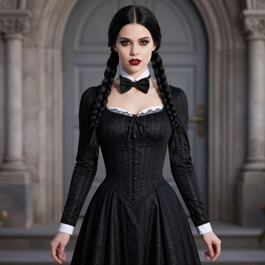 Peruka Wednesday Addams Costume, woman with a black dress and a black bow tie