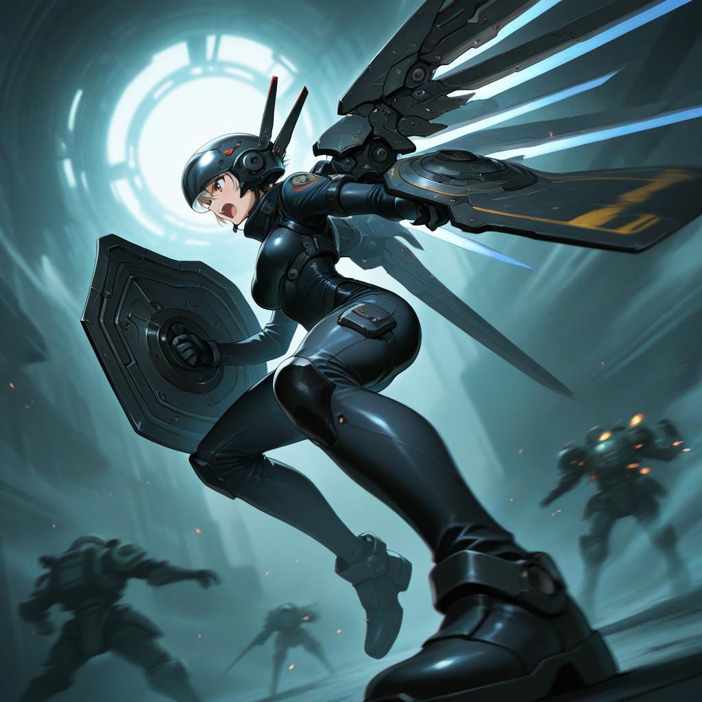 Wrenchsmechs, 1girl, glowing, black mecha, wings, halo, long hair, mechanical wings, wrenchsfantasy, fantasy, glowing eyes, holding sword, sword