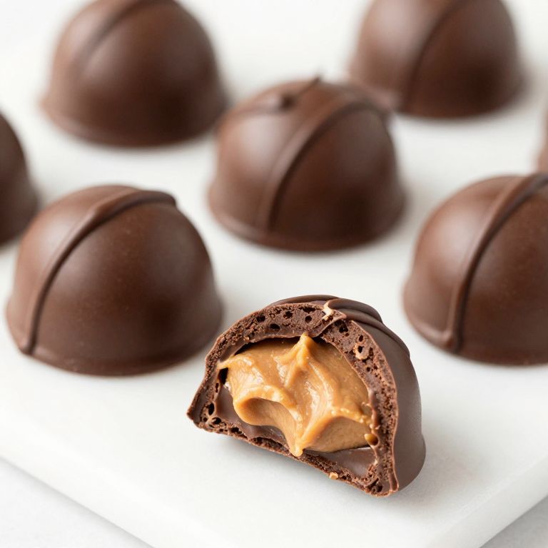Photograph of a broken, dark chocolate truffle with creamy, beige caramel center, surrounded by whole truffles on a white background.