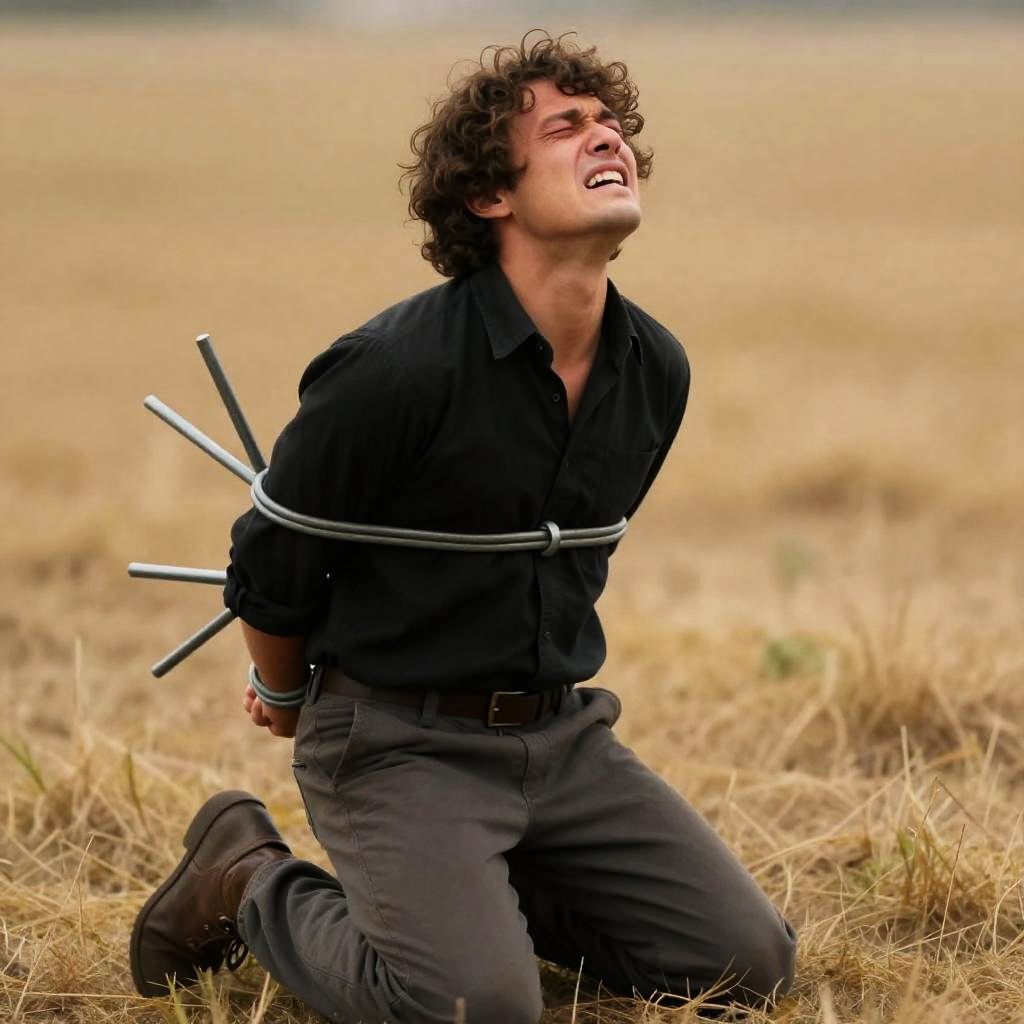 Man with curly brown hair, black shirt, and gray pants kneels in dry grass, head tilted back, arms bound behind by several metal rods. Intense expression of pain, golden-brown field background. Film still.