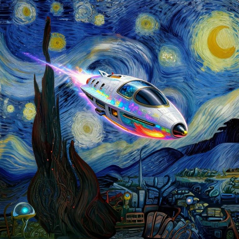 Digital art mashup of Van Gogh's "Starry Night" with a colorful, futuristic spaceship flying above a sci-fi cityscape and alien-like