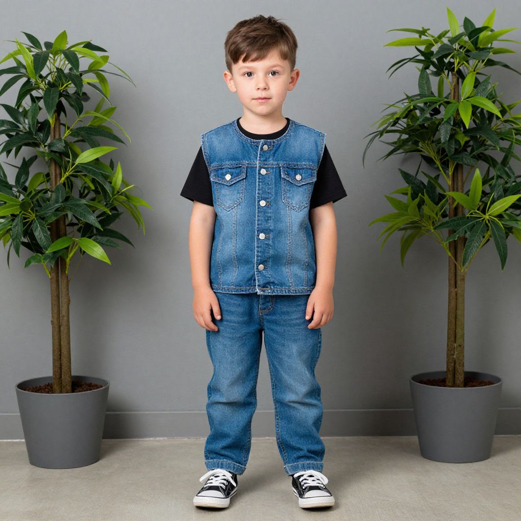 Photograph of a young Caucasian boy with short brown hair, standing in front of a grey wall. He wears a blue denim vest over a black t-shirt, blue denim jeans, and black and white sneakers. His expression is neutral, and he looks directly at the camera. Two potted green plants are positioned symmetrically on either side of him, with dark grey pots resting on a light grey concrete floor. The lighting is even, highlighting the textures of his clothes and the plants' leaves.