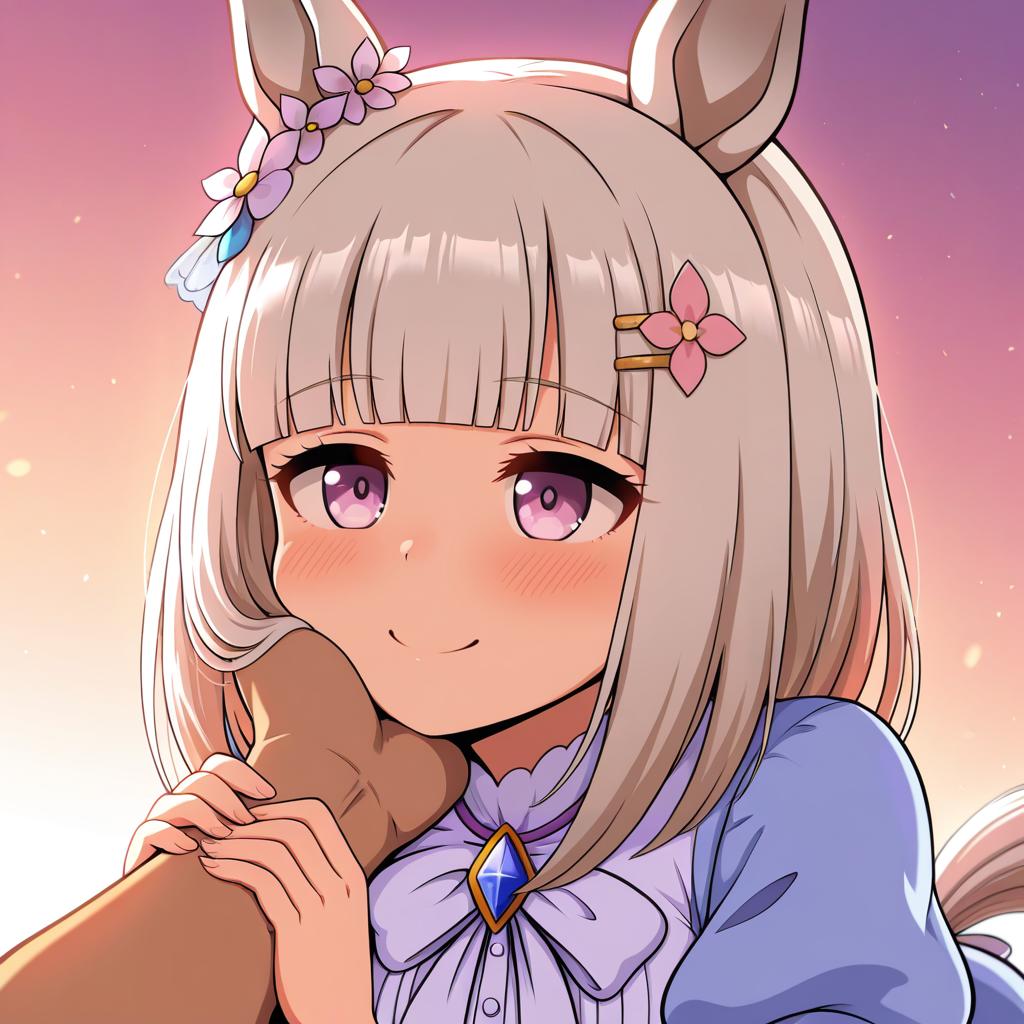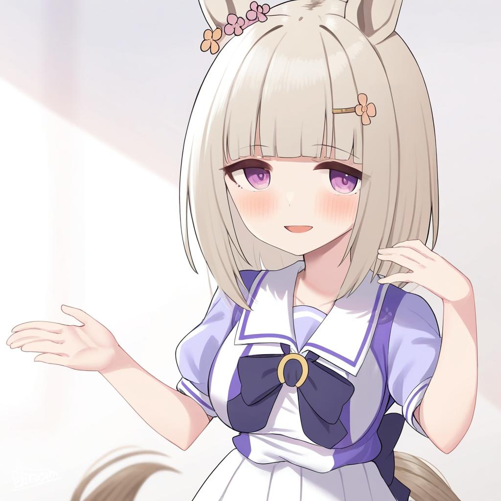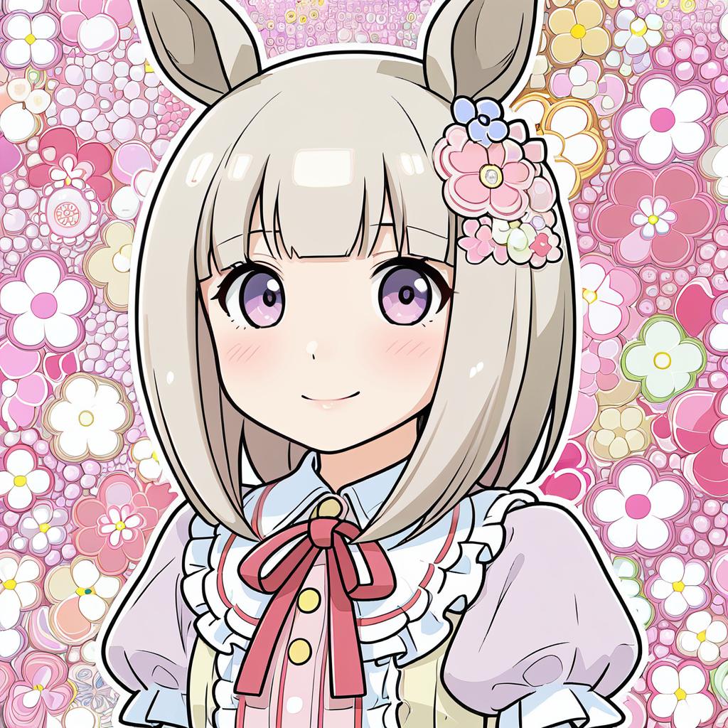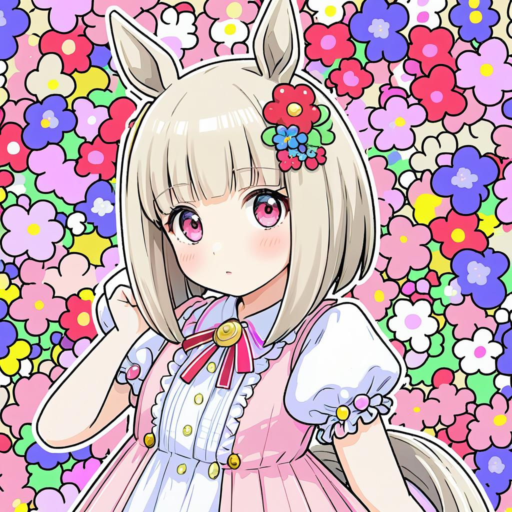 Happy meek (umamusume), umamusume, 1girl, horse girl, horse ears, horse tail, pink eyes, red eyes, medium hair, blunt bangs, hair flower, hairclip, puffy short sleeves, by artist tateha (marvelous grace), leet