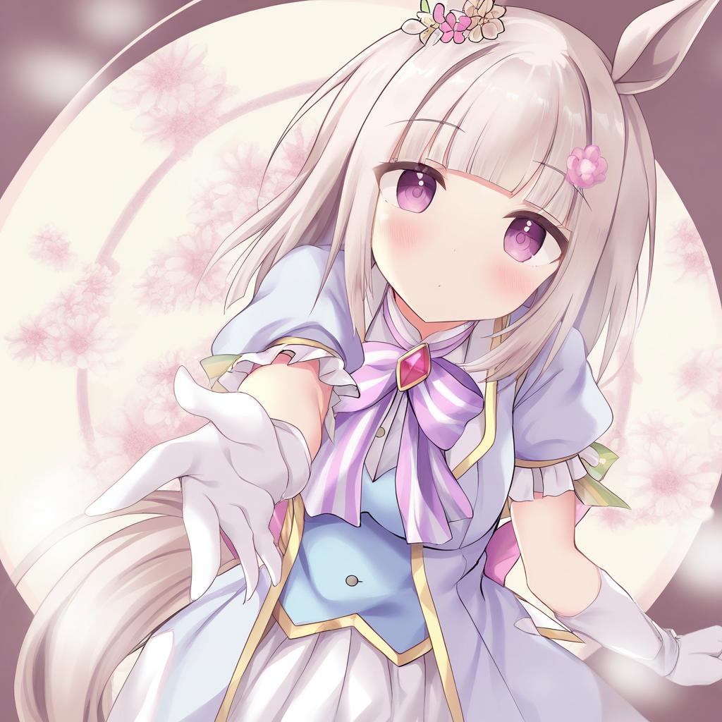 Digital anime-style illustration of a single horse girl character with light blonde medium hair, blunt bangs, and pink eyes. She wears a light blue and white dress with puffy short sleeves, a large purple bow tie, and white gloves. Floral hair accessories and horse ears and tail are visible. The character is set against a soft pink and cream circular background with floral patterns, reaching out towards the viewer.