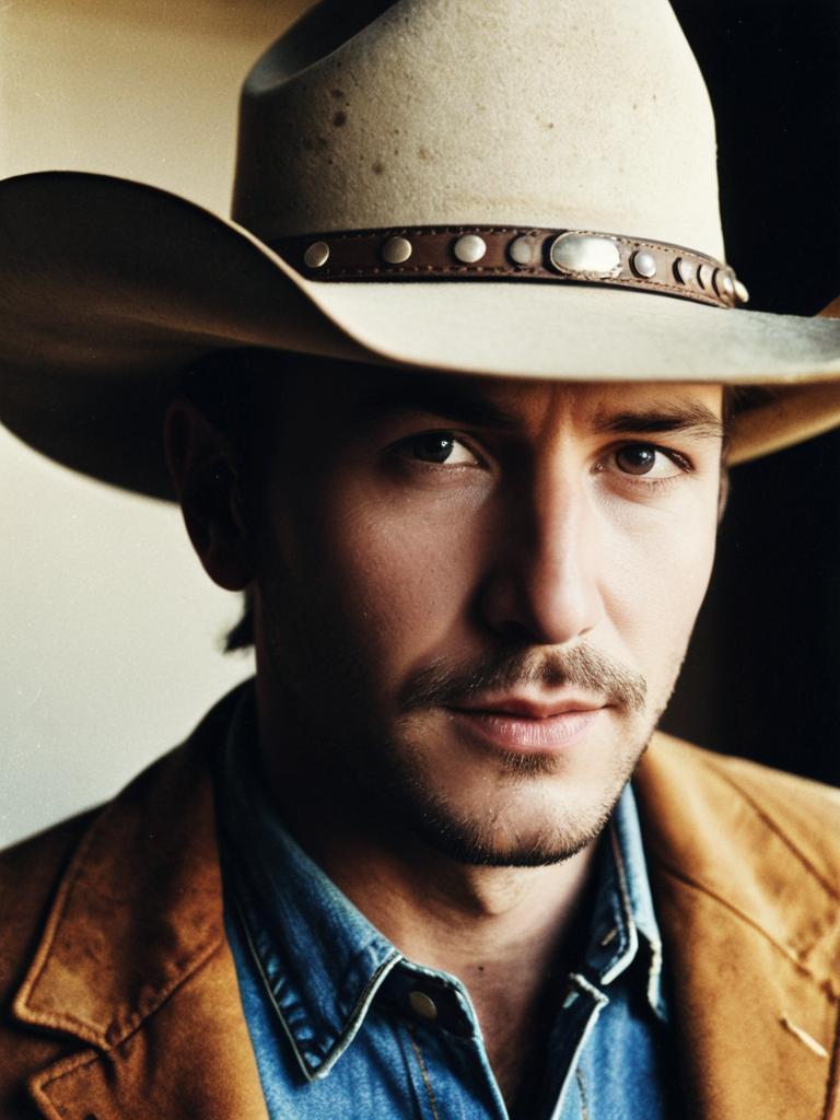 Close-up portrait of a man wearing a brown cowboy hat with decorative conchos, a denim shirt, and a suede jacket. The man has light facial hair and a serious expression, set against a blurred outdoor background with mountains.