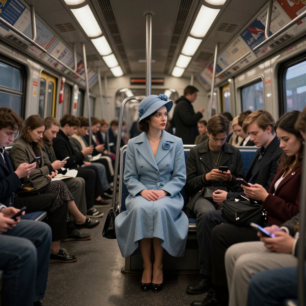 In this striking image, an elegantly dressed woman from the 1940s, adorned in a light blue coat and a matching hat with a floral accessory, sits alone on a modern-day London tube train. Her attire contrasts sharply with the contemporary surroundings, where numerous young people are engrossed in their mobile phones, oblivious to their surroundings. The scene is captured from an ultra-wide angle, zoomed out to encompass the entire train carriage, highlighting the stark contrast between the vintage and modern eras. The lighting is moody and cinematic, with natural lighting and incandescent elements creating a dramatic effect. The image is meticulously detailed, with hyper-realistic textures and intricate shadows, rendered using Unreal Engine and Cinematic Color Grading. The shot is taken with a 22mm lens, capturing the depth of field and the subtle interplay of light and shadow. The overall composition is dynamic, with the woman positioned centrally, drawing the viewer's attention amidst the sea of modern-day commuters. The image is a beautiful blend of past and present, captured with an editorial photography style, showcasing the contrast between the two eras in a visually stunning manner.