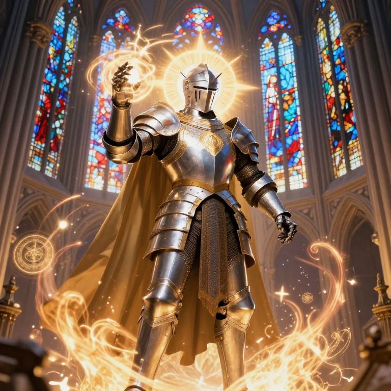 Photograph of a shining, armored knight with a glowing halo, standing in a grand cathedral with vibrant stained glass windows, surrounded by swirling flames.