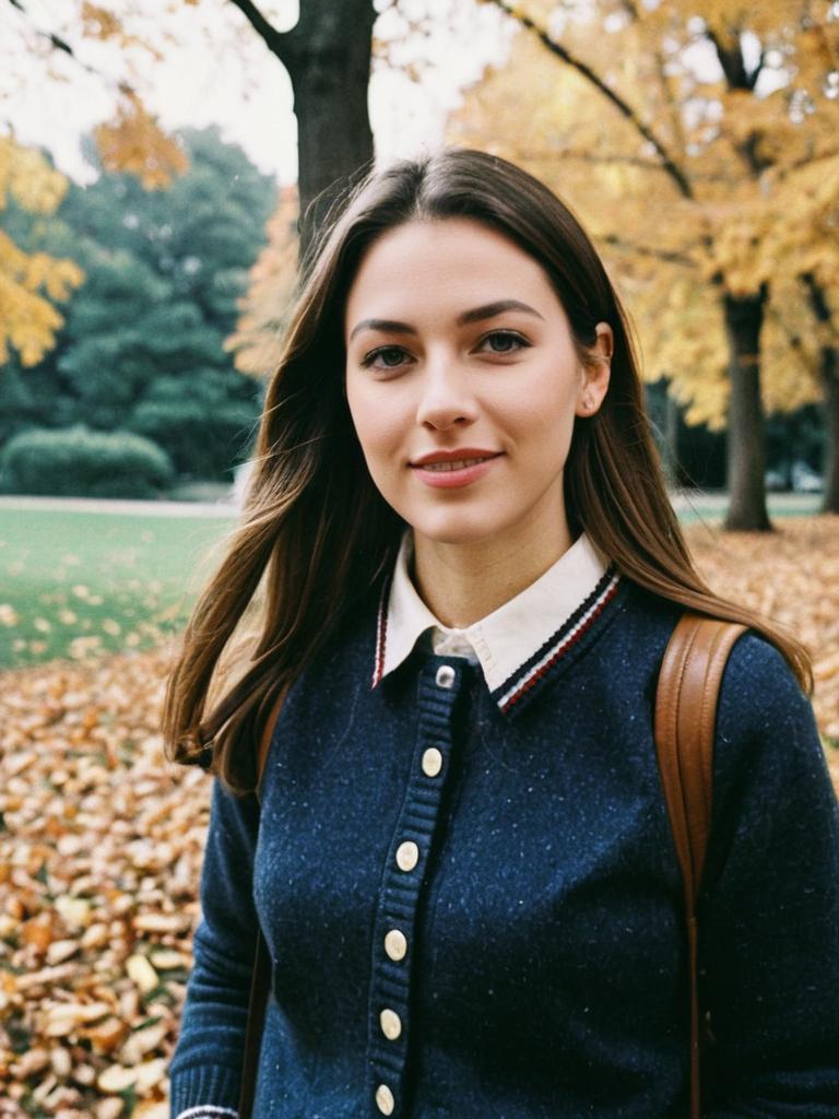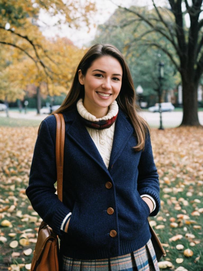 Woman in Preppy Fall Outfit, candid outdoor portrait, natural daylight