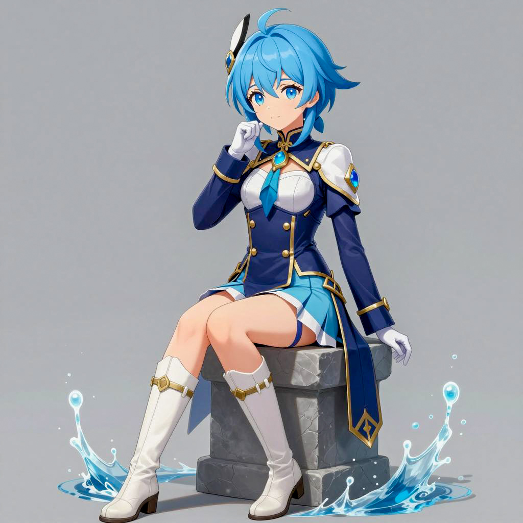 Digital illustration of a female character with short black hair, blue and white outfit, including a blue crop top with high collar, white shorts, blue and black thigh-high boots, and blue gloves. She stands on a crystal base, posing with one hand raised. Dark background. Her expression is confident. She has light skin and a toned physique. The crystals are blue with a translucent, icy ure. The character's right leg is raised slightly, balancing on the toes of her left foot. She has blue eyes and a determined look.