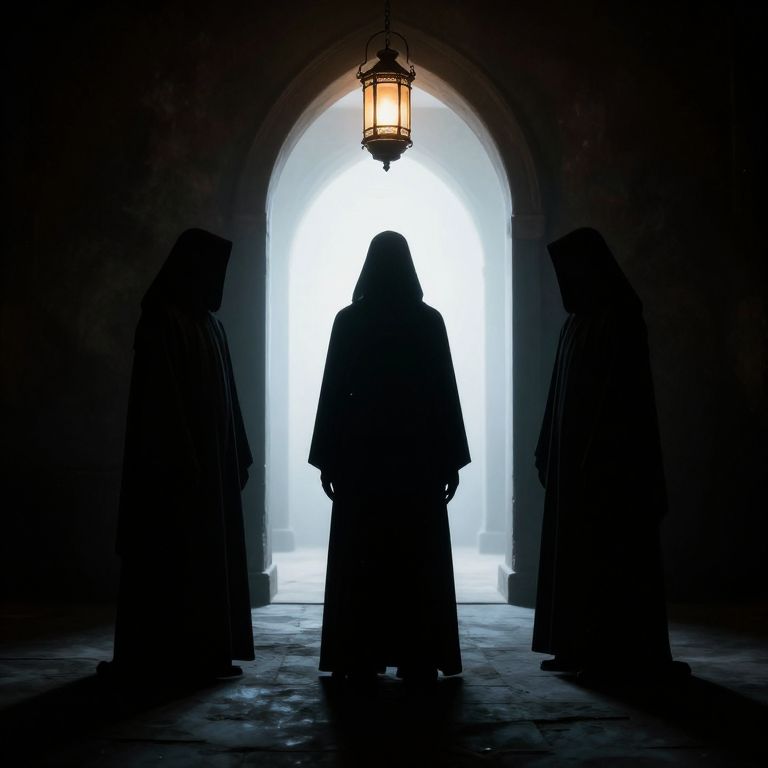 In a dimly lit chamber, three shadowy figures stand before a luminous portal, their forms cast by a mysterious, lantern-like device that defies the laws of light and shadow, creating an otherworldly interplay between reality and illusion.