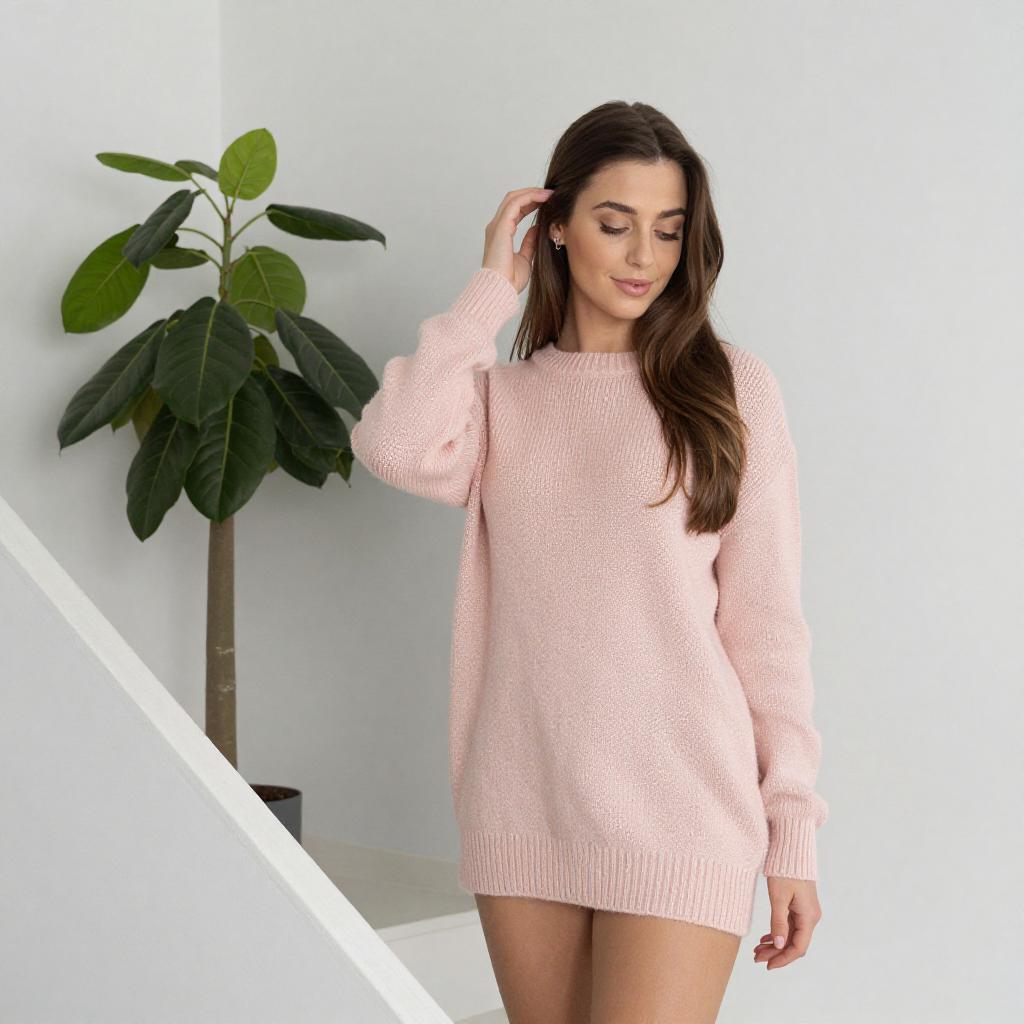 Photograph of a young woman with long brown hair, wearing a light pink, long-sleeve, knit sweater that reaches mid-thigh. She stands on a white staircase, one hand touching her hair, with a large green potted plant to the left. The background is a minimalist, white-walled interior.
