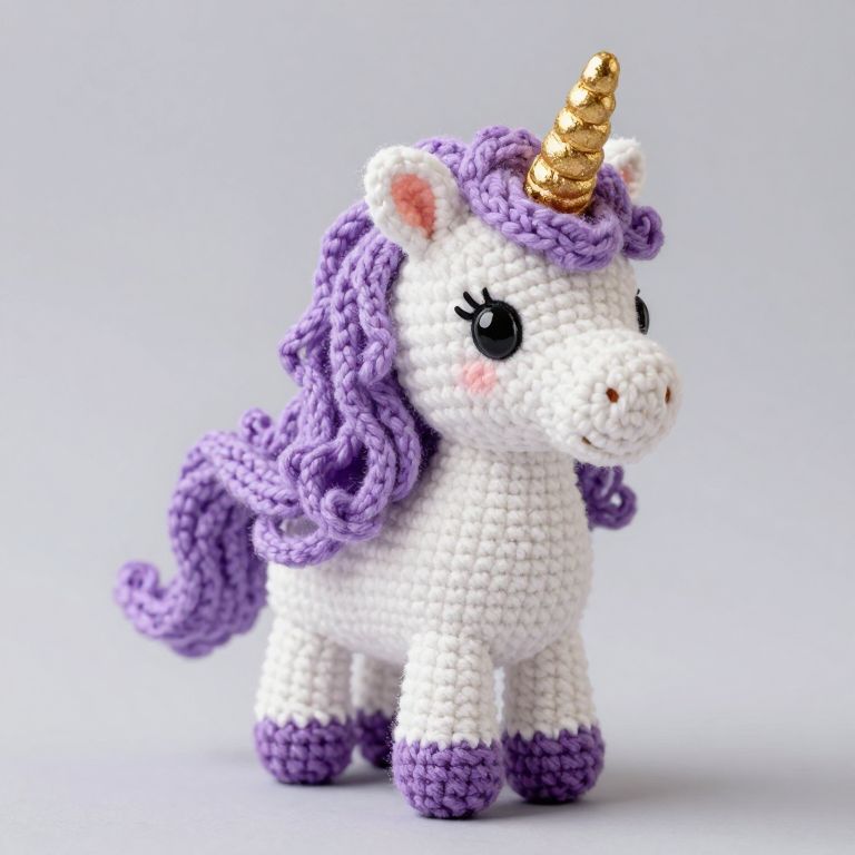 A whimsical crocheted unicorn, adorned with a golden horn and a flowing purple mane, stands as a charming embodiment of magical wonder, defying the mundane with its soft, textured charm and enchanting presence.