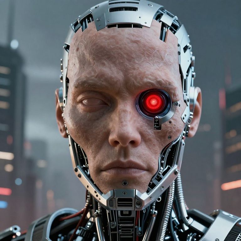 Terminator half face close-up, seamless blend of flesh and advanced machinery, intricate robotic wiring and metal plates, glowing red eye, dystopian cityscape backdrop, high contrast, cinematic atmosphere