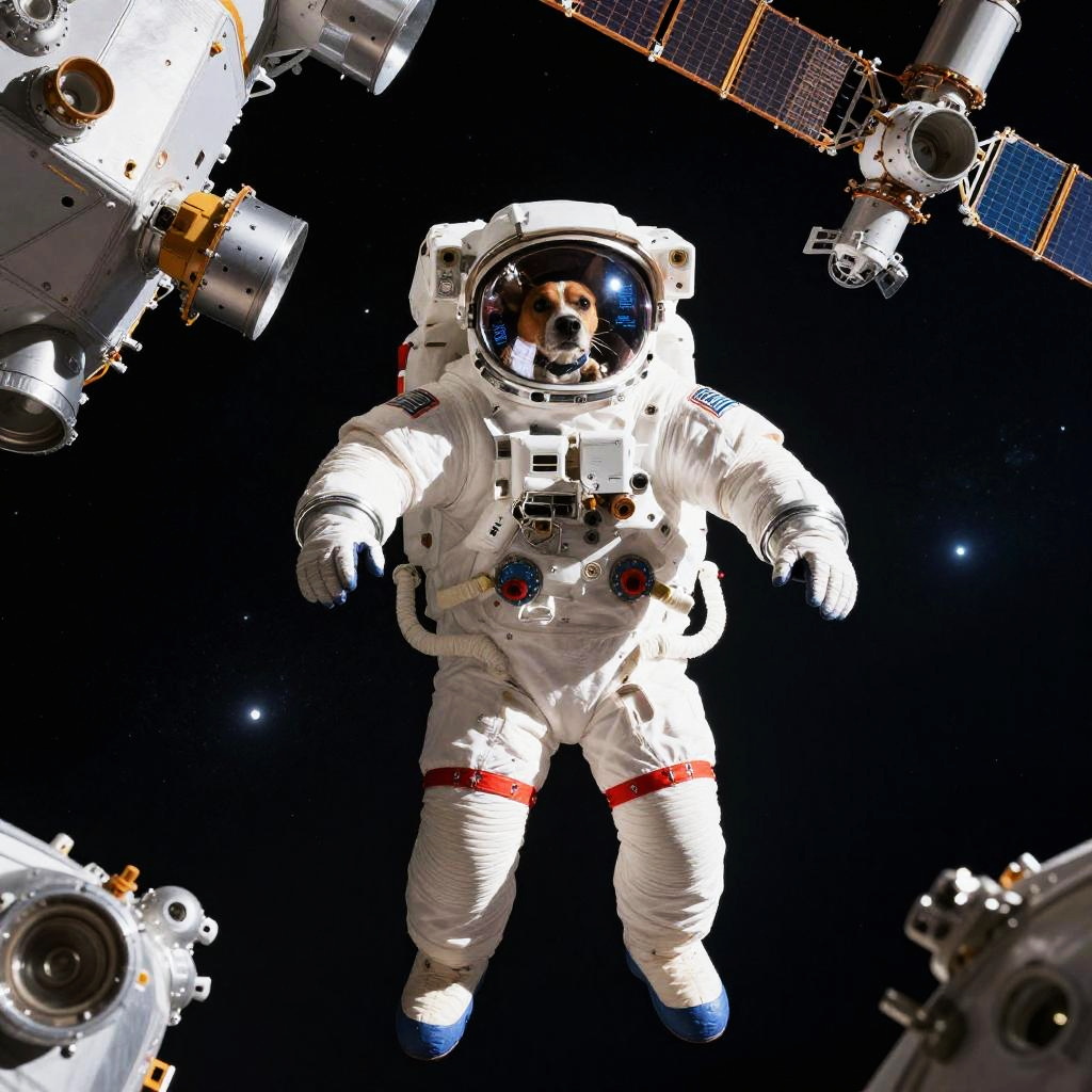 Dog space suit on spacewalk repairing satellite, stars and galaxies around, metallic space station parts, dynamic pose, futuristic helmet with HUD display