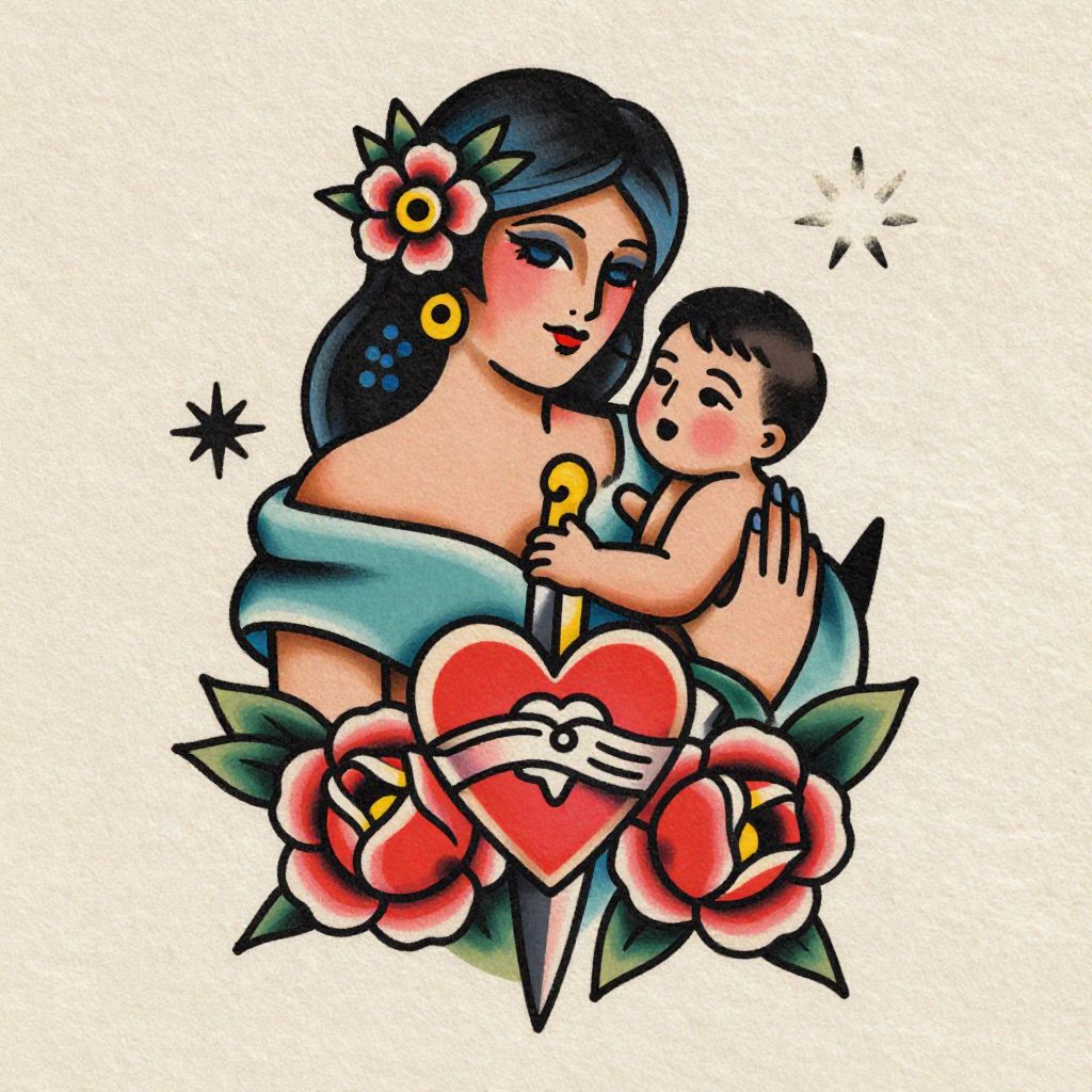 American traditional family tattoo design, bold outlines and primary colors, mother holding child with heart and dagger elements, vintage tattoo style with roses and nautical stars included