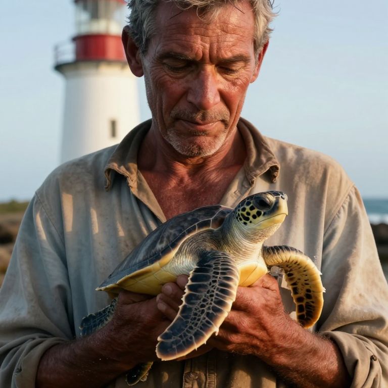 Envision an ultrarealistic portrait of a weathered lighthouse keeper with sun-kissed skin and rugged features, tenderly holding a newly hatched sea turtle against his chest. Captured from a unique 'bug's eye view' perspective, the scene combines realism and impressionism, showcasing worn clothing and calloused hands. Soft morning light bathes this poignant moment in warm hues, evoking emotions of nature's resilience and humanity's connection to the environment.