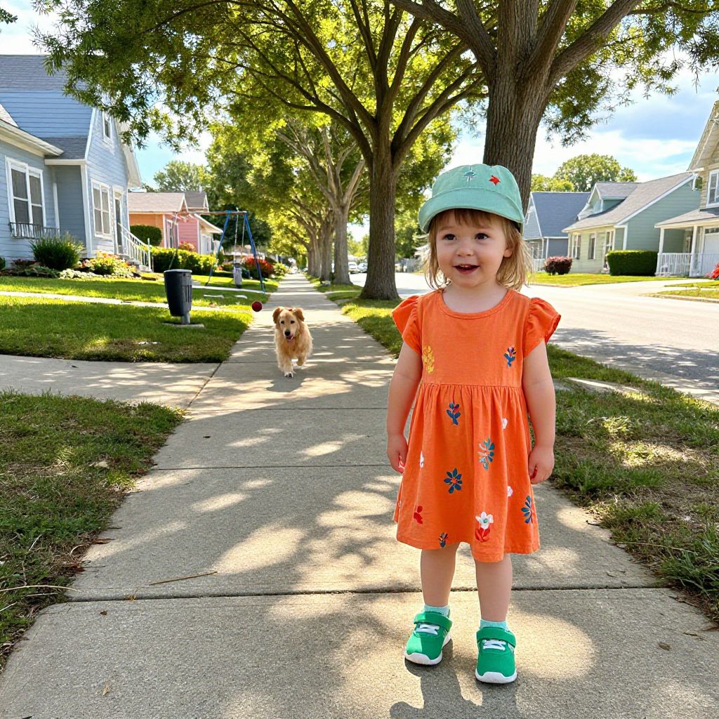A small child, around 4 years old, with bright green sneakers, a cheerful orange dress with floral patterns, and a soft green cap adorned with a tiny star, is standing on a sunny sidewalk, looking slightly curious and happy with a wide smile. The warm sunlight filters through the leaves of tall trees in the background, casting dappled shadows and golden rays across the pavement. In the distance, a small, playful golden retriever runs joyfully, chasing a red ball, while a colorful suburban neighborhood comes into view—pastel houses, a swing set, and a garden with blooming flowers. The scene captures a warm, cheerful, and innocent moment in a peaceful, tree-lined suburban street, filled with life and gentle joy, evoking a sense of simplicity and happiness.
