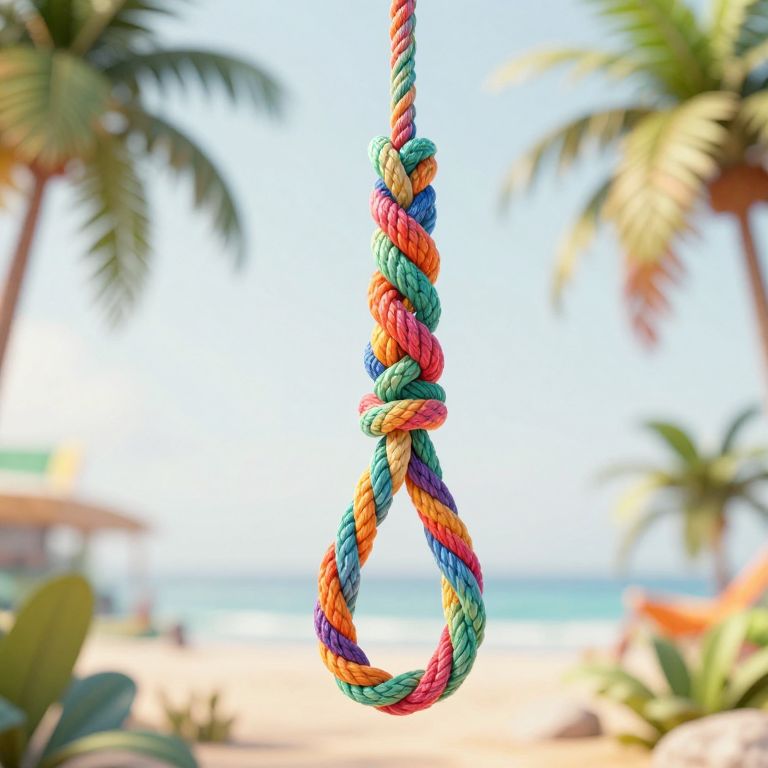 A 3D-rendered, highly detailed, 8k image of a colorful, twisted rope in a tropical palette, suspended in midair with a loop at the bottom.