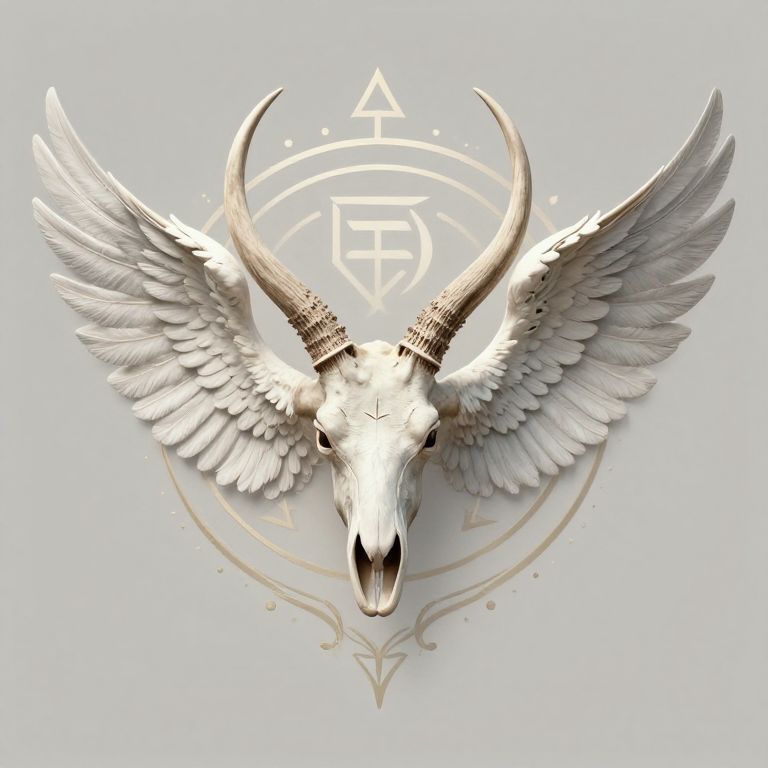 An ethereal fusion of power and mystery unfolds in this emblematic design, where winged antlers and cryptic symbols evoke a sense of transcendence and otherworldly freedom, inviting contemplation on the primal connection between nature and the divine.