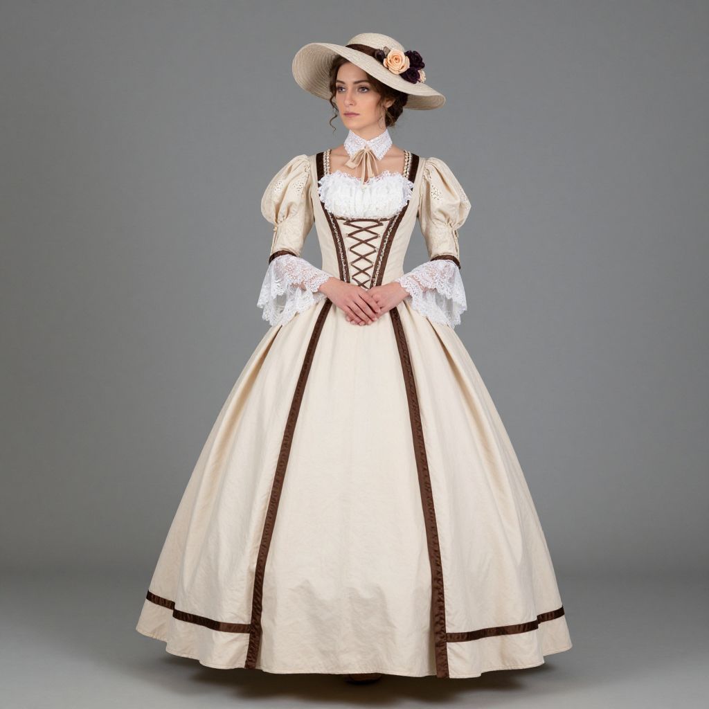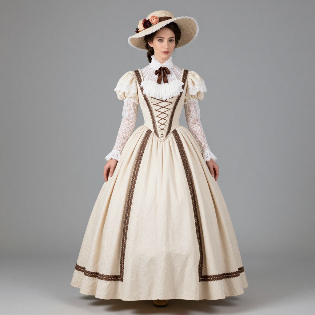 Elegantly poised woman donning a Victorian-era ensemble featuring a voluminous cream skirt with brown trim, a fitted bodice with lace detailing, puffed sleeves, and a wide-brimmed hat adorned with floral embellishments.