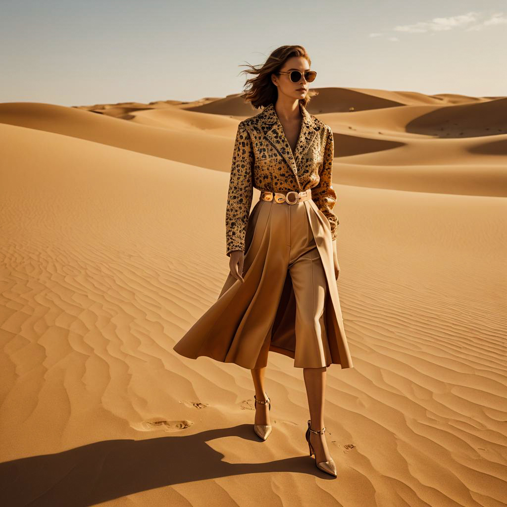Glamour photo of a woman posing for InStyle. desert landscape with golden dunes, retro film-inspired warm tones, High Fashion Power Stance: Legs wide apart, colorful very strong detailed perfect light, cinematic aesthetic, professional, excellent composition, dynamic, atmosphere, warm inviting, lively, marvelous, intricate, highly coveted, delicate, epic, fantastic, artistic, fabulous, beautiful, awesome. Clothes inspired by Fendi.