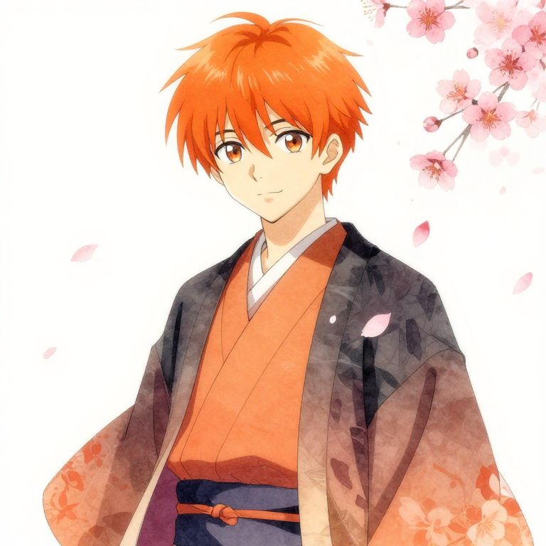 Orange anime guy with bright orange hair and expressive eyes, dressed in a traditional Japanese kimono with modern twists, cherry blossoms falling around him, serene and powerful atmosphere, watercolor-inspired anime style