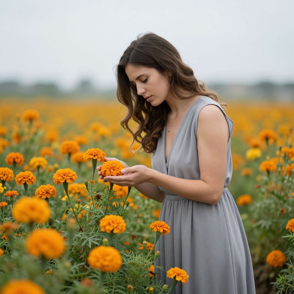 Photograph of a young woman with wavy brown hair, wearing a sleeveless, light gray dress, standing in a vibrant orange marigold field. She is gently holding a marigold flower close to her face, her eyes focused downward. The background is a blurred, expansive field of marigolds under an overcast sky, creating a serene and natural setting. The woman's soft, fair skin contrasts with the bright orange flowers, and her delicate, feminine attire complements the gentle, pastoral scene.