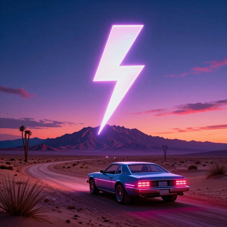 A neon-lit, cyberpunk desert landscape features a car driving towards a mountain with a large, vibrant lightning bolt in the sky, set against a sunset with a retro 80s vibe.