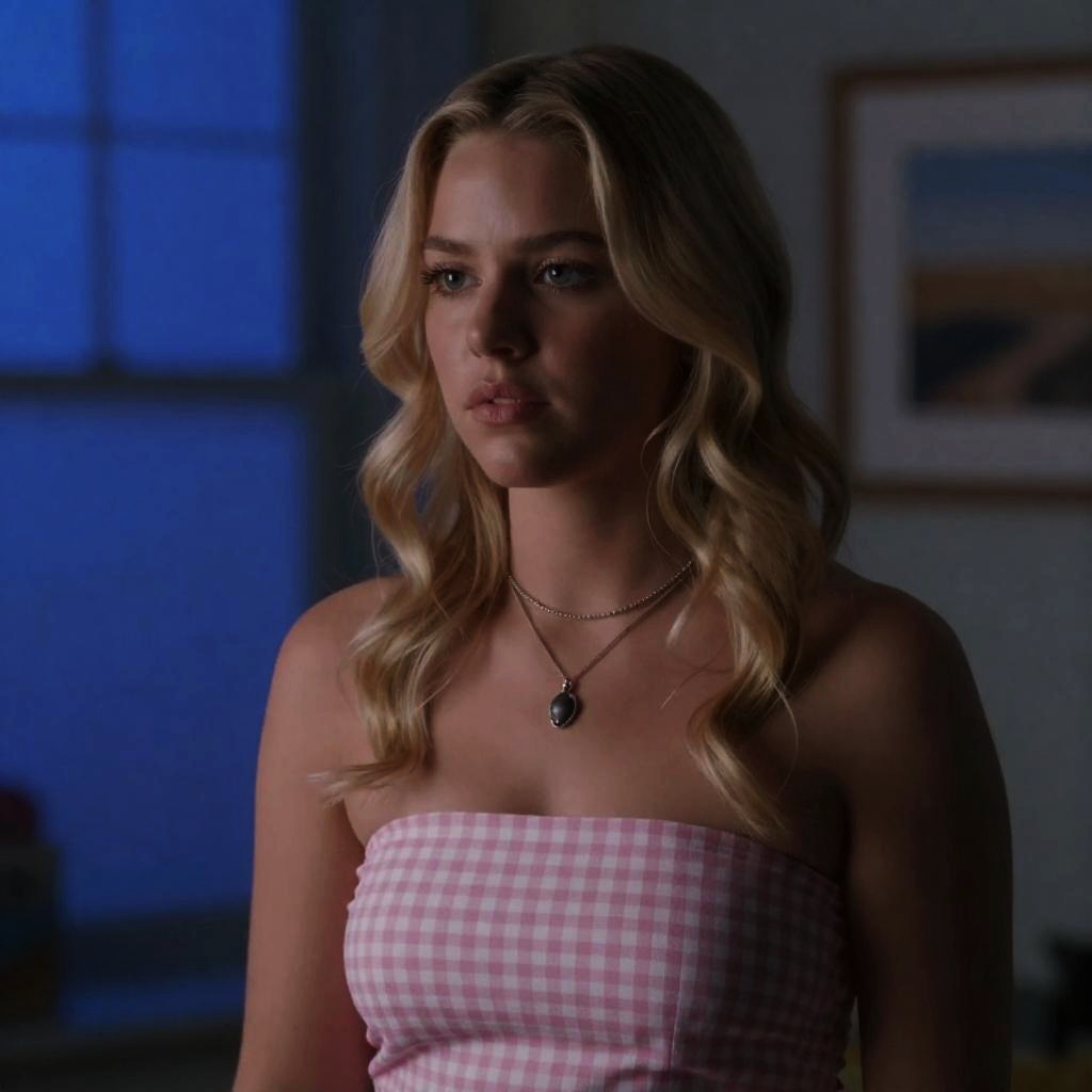Photograph of a woman with wet, blonde, shoulder-length hair, wearing a gray robe. She has light skin, blue eyes, and pink lipstick, looking to the left with a slight smile. Background is a blurred, ured wall. Light source from the left.