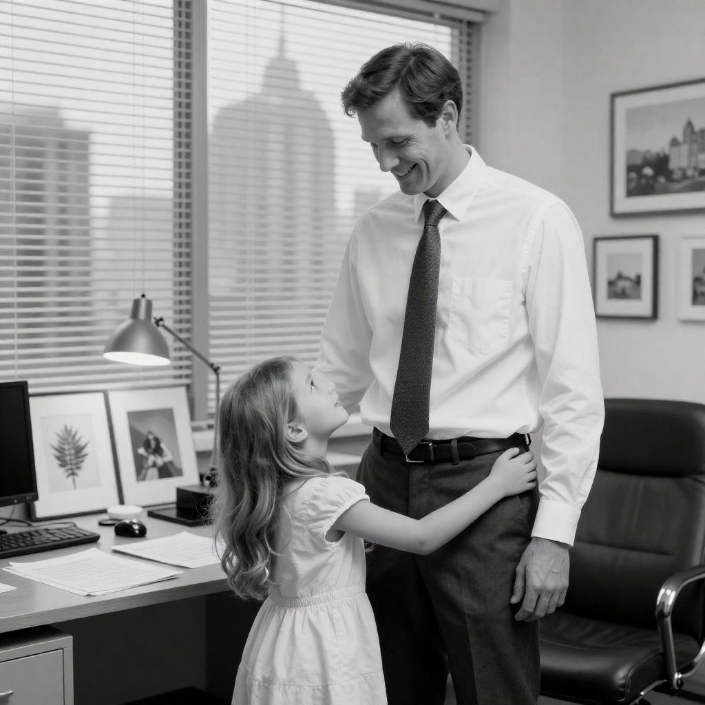 Black and white photograph. Man and young girl in office. Man in white shirt, dark tie, dark pants, smiling. Girl with blonde hair, light dress, reaching up, hugging his waist. Desk with lamp, papers, and art prints. Window shows cityscape. Blinds partially open. Man's hand on girl's shoulder. City buildings visible outside window.