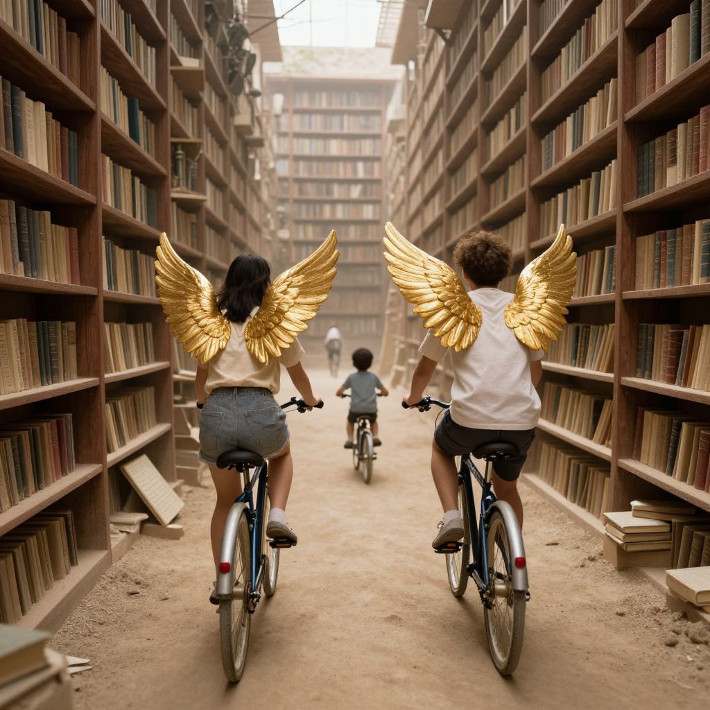 Two individuals with golden wings ride bicycles along a dusty path flanked by towering shelves filled with books, accompanied by a child on a smaller bike and another figure in the distance, all navigating through a surreal, library-like canyon bathed in soft sunlight.