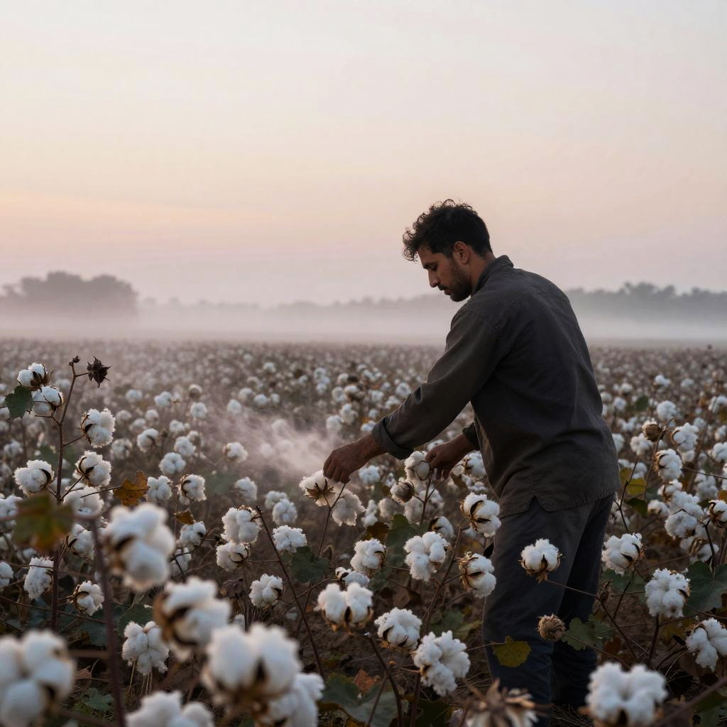 Guy picking cotton at dawn, mist rising from the fields, soft pastel colors in the sky, tranquil rural atmosphere, detailed depiction of the cotton plant's fibers and stems, gentle breeze moving leaves, impressionistic style with realistic elements.