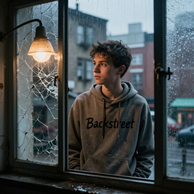 A realistic photo of a teenage boy looking out through a cracked window of a rundown backstreet apartment, face illuminated by a dim lamp, wearing a faded hoodie with 'Backstreet' written on the front in black ink, rainy cityscape visible behind him.