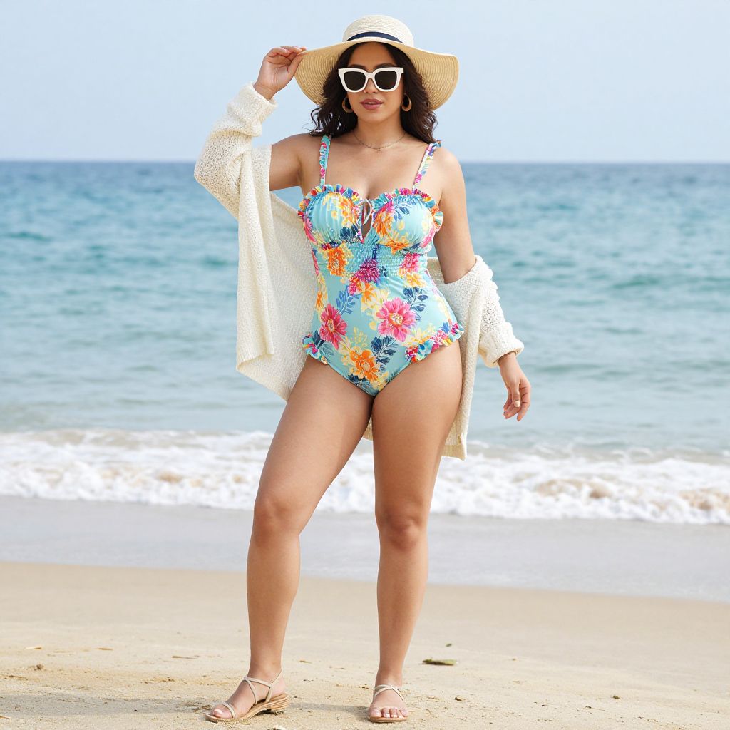 Full body shot, Curvy woman, vibrant floral swim romper, lightweight breathable fabric, adjustable straps, high-waisted design, playful ruffles, soft pastel colors, oversized knitted beach sweater, open front, loose fit, cozy texture, rolled sleeves, casual chic vibe, accessorized with wide-brimmed sun hat, oversized sunglasses, strappy sandals, beach-ready look Sexy. Pretty face and beаutiful eyes. Big breasts