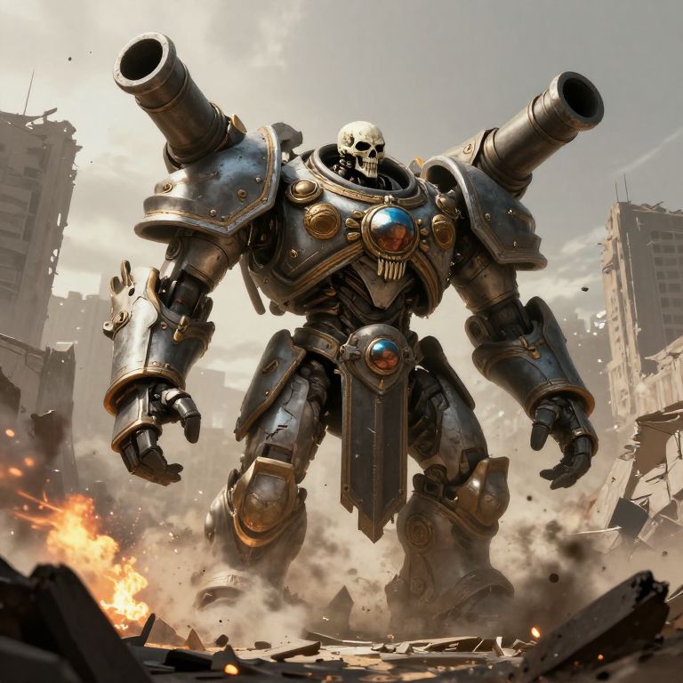 Photorealistic digital artwork of a massive, armored robot with a skeletal head, standing in a war-torn city. The robot, with two large cylindrical cannons on its back, is clad in metallic armor adorned with gold accents and blue glowing orbs. Dust and debris surround it, with a burning building in the foreground. Tall, damaged skyscrapers loom in the background under a cloudy sky. The robot's design blends futuristic and steampunk elements, evoking a sense of destruction and power. The scene is dynamic, capturing the intensity and chaos of the moment.