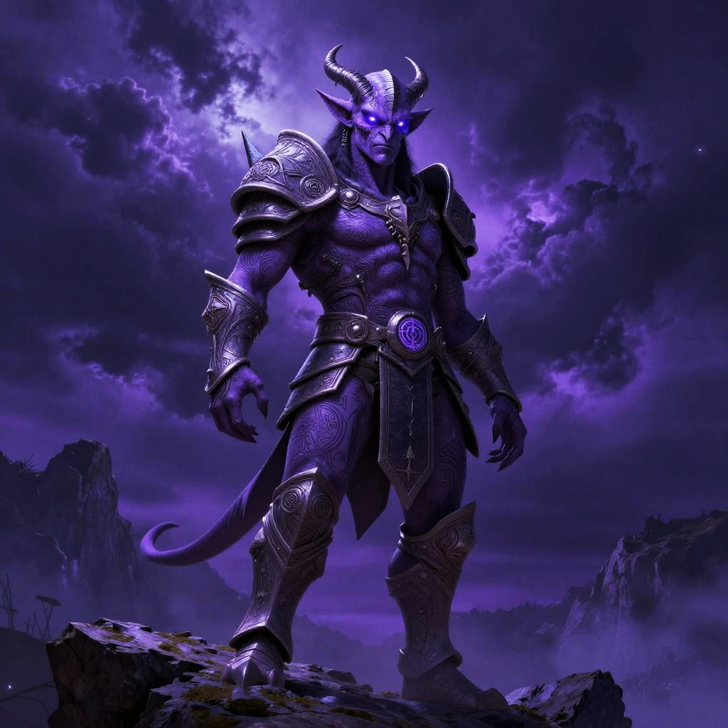 Purple tiefling standing on a rocky cliff under a stormy sky, glowing eyes and intricate demonic tattoos, wearing ornate armor with mystical symbols, dark fantasy art style, dramatic lighting and vibrant purple hues.