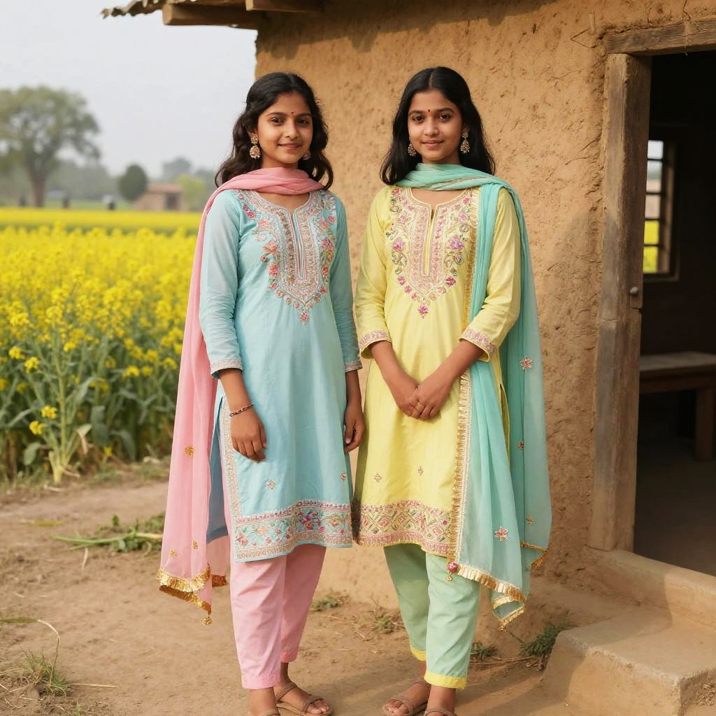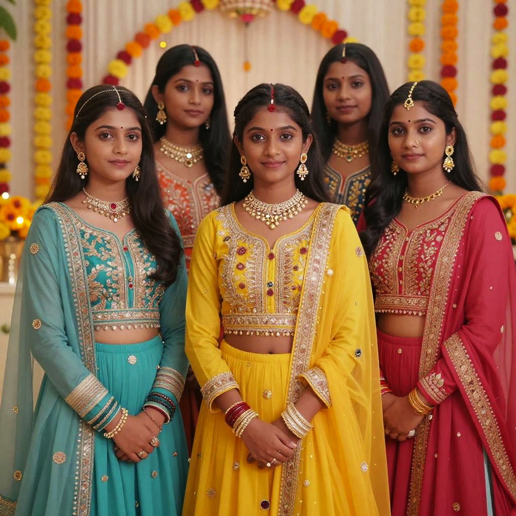 Indian girls dress in vibrant traditional attire, intricate embroidery and bright colors, flowing fabrics like silk and chiffon, elegant jewelry, festive setting with marigold flowers and colorful decorations, soft natural lighting, cultural celebration mood