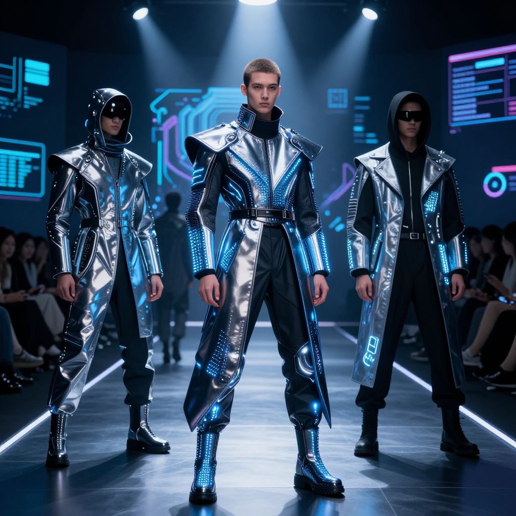 Photograph: Three men on futuristic runway in shiny silver and black metallic outfits with neon blue accents, black hoods, and sunglasses. Background: digital