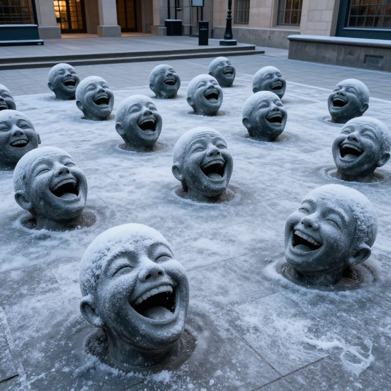 Photograph of a public art installation featuring twelve bronze heads of laughing children, each with wide, open-mouthed smiles, emerging from a circular, shallow water basin. The water is slightly frothy, and the children's heads are coated in a fine layer of mist or frost, giving a cold, textured appearance. The background shows a modern urban setting with stone buildings, glass windows, and metal railings. The lighting is cool and blue-toned, enhancing the chilly atmosphere. The children's heads are evenly spaced in a circular pattern, creating a sense of symmetry and playful energy.