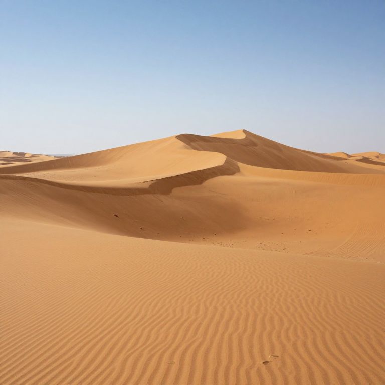 Photograph of sunlit desert sand dunes with rippled textures, golden-orange sand, and clear blue sky, capturing the serene beauty of the desert