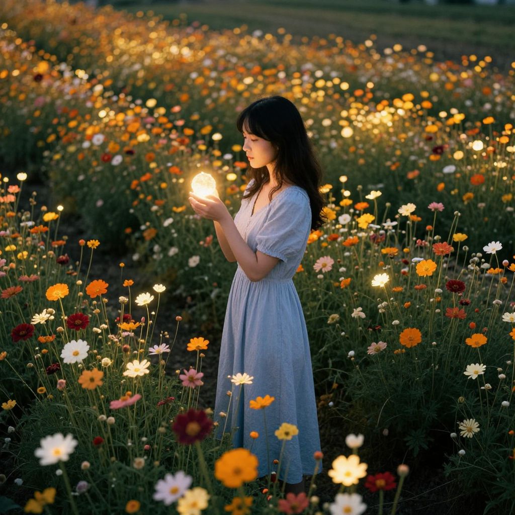 A woman stands amidst a vast field of vibrant, glowing flowers, holding a small, illuminated object that seems to capture the essence of the luminous blooms, evoking a serene and otherworldly atmosphere.